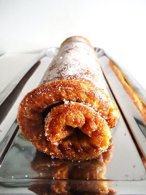 Retire do forno e desenforme sobre papel vegetal polvilhado com açúcar. Enrole com a ajuda do mesmo e deixe arrefecer enrolada no papel.
